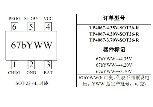 TP4067 3-600mA双灯指示双防反接 TP4067 实际充电电流可从 3mA-600mA,双灯指示,不仅带有电池端反接保护,连输入端Vcc也有反接保护,而且加入电源输入自适应功能,有更广的应用场合。TP4067有4.35V、4.2V、3.7V、2.8V 四种满充电压可供选择。